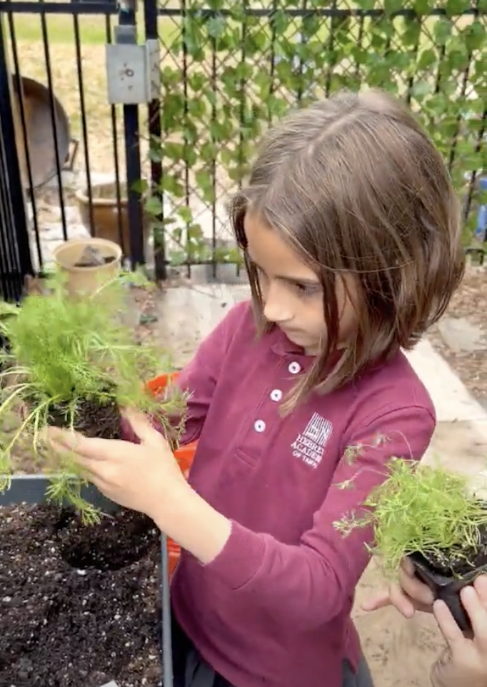 The young gardener displays her new skill of loosening the root ball of a plant before planting.